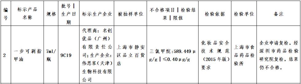 經(jīng)濟(jì)日?qǐng)?bào)-中國(guó)經(jīng)濟(jì)網(wǎng)9月25日訊(記者 韓璐) 上海市藥品監(jiān)督管理局23日發(fā)布的抽檢公告顯示,由名創(chuàng)優(yōu)品(廣州)有限責(zé)任公司代理的指甲油添加禁用物質(zhì)三氯甲烷,并且經(jīng)企業(yè)申請(qǐng)復(fù)檢后結(jié)果仍不合格。 檢驗(yàn)結(jié)果顯示,該產(chǎn)品中三氯甲烷的含量高達(dá)589.449μg/g,相比《化妝品安全技術(shù)規(guī)范》(2015年版)中規(guī)定的檢測(cè)限值超標(biāo)1400多倍。