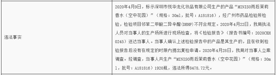 廣東省藥品監(jiān)督管理局官網(wǎng)公布的行政處罰決定書顯示,2020年4月9日,標(biāo)示深圳市悅?cè)A龍化妝品有限公司生產(chǎn)的產(chǎn)品“MINISO雨后茉莉香水(空中花園)”(規(guī)格:30ml,批號(hào):A181816),經(jīng)廣州市藥品檢驗(yàn)所檢驗(yàn),檢驗(yàn)項(xiàng)目鄰苯二甲酸二異辛酯(DEHP)不符合規(guī)定。
