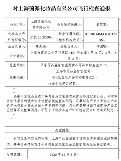 飛行檢查報告顯示,在檢查中發(fā)現(xiàn)上海茵派化妝品有限公司在廠房與設(shè)施方面存在未建立環(huán)境監(jiān)測計劃、非潔凈區(qū)到潔凈區(qū)的緩沖間未設(shè)置聯(lián)鎖裝置等問題,在物料與產(chǎn)品方面存在產(chǎn)品標簽未按相關(guān)要求標注生產(chǎn)日期等問題,在生產(chǎn)管理方面存在部分產(chǎn)品工藝規(guī)程不完整等問題。