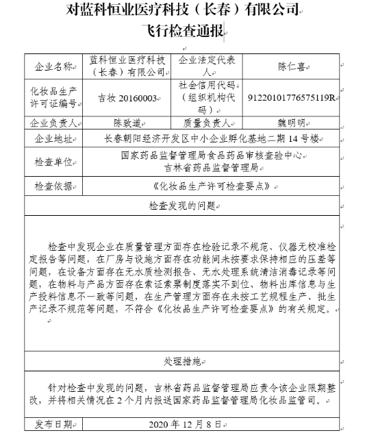 中國(guó)經(jīng)濟(jì)網(wǎng)北京12月10日訊(記者 朱國(guó)旺 楊奇奇)12月8日,國(guó)家藥監(jiān)局發(fā)布的對(duì)藍(lán)科恒業(yè)醫(yī)療科技(長(zhǎng)春)有限公司飛行檢查通報(bào)顯示,該企業(yè)在質(zhì)量管理、廠房與設(shè)施等方面存在問(wèn)題,不符合《化妝品生產(chǎn)許可檢查要點(diǎn)》的有關(guān)規(guī)定。據(jù)國(guó)產(chǎn)非特殊用途化妝品備案平臺(tái)顯示,該企業(yè)為芙芙、E100等化妝品品牌的生產(chǎn)企業(yè)。