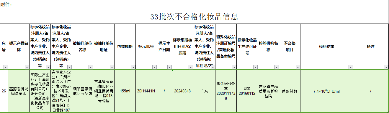 中國經(jīng)濟網(wǎng)北京11月16日訊(記者楊奇奇)11月15日,國家藥監(jiān)局發(fā)布《關于33批次不合格化妝品的通告》顯示,1批次高姿澎湃沁潤晶瑩水不合格。