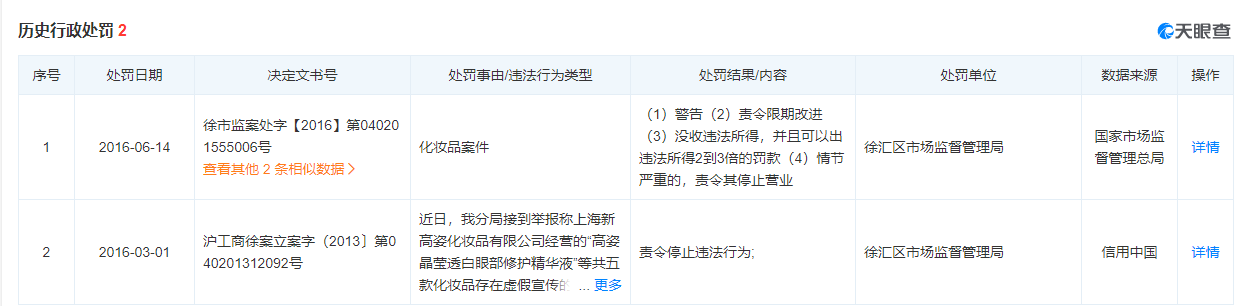據(jù)天眼查,上海新高姿化妝品有限公司曾有兩次歷史行政處罰記錄,一次因添加了未經(jīng)審批的配方被警告,并沒收違法所得;一次因虛假宣傳,違反了《中華人民共和國反不正當競爭法》《上海市反不正當競爭條例》等相關法律被責令停止違法行為。