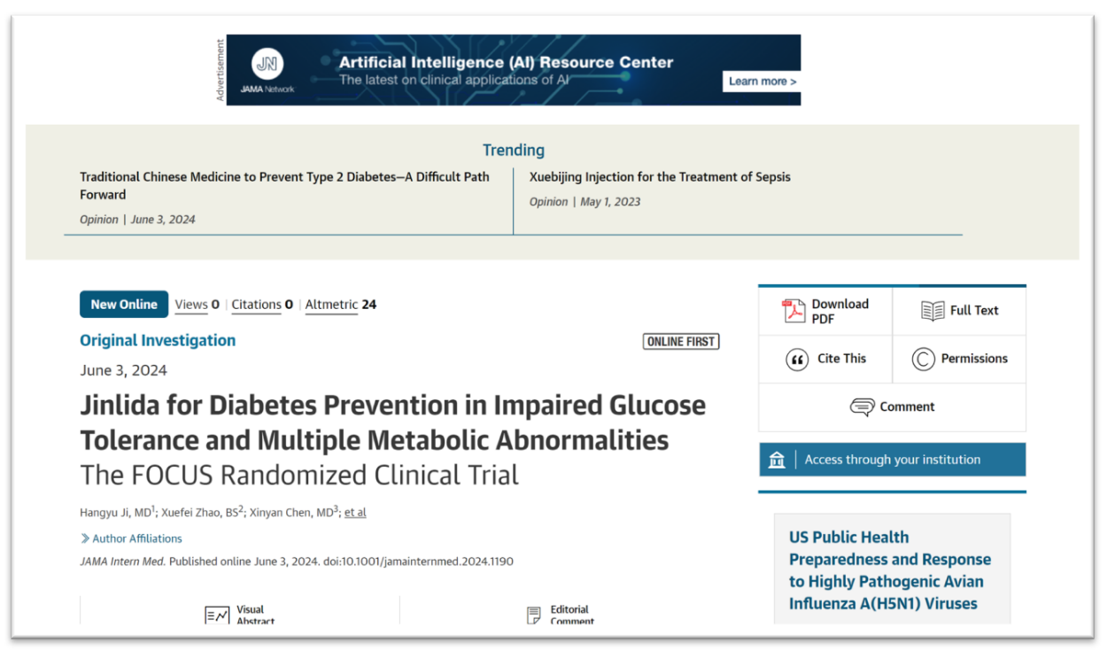 美國當(dāng)?shù)貢r(shí)間2024年6月3日,以嶺藥業(yè)生產(chǎn)的創(chuàng)新中藥津力達(dá)顆粒循證研究論文《津力達(dá)對糖耐量異常合并多代謝紊亂人群的糖尿病預(yù)防效果——FOCUS隨機(jī)臨床試驗(yàn)》在國際權(quán)威醫(yī)學(xué)期刊《美國醫(yī)學(xué)會雜志·內(nèi)科學(xué)》(JAMA Internal Medicine,影響因子39)發(fā)表。論文介紹了津力達(dá)干預(yù)代謝綜合征糖耐量異常人群取得的重大成果——津力達(dá)可降低糖耐量異常合并多代謝紊亂人群罹患糖尿病的風(fēng)險(xiǎn),為糖尿病的預(yù)防提供了新的視角和策略。