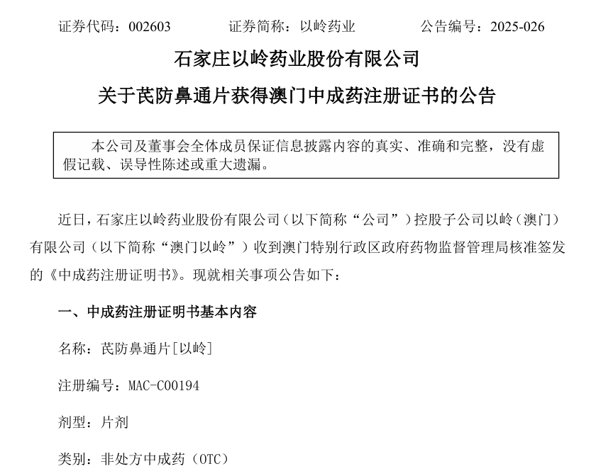 以嶺藥業(yè)1.1類新藥芪防鼻通片獲澳門中成藥注冊證書