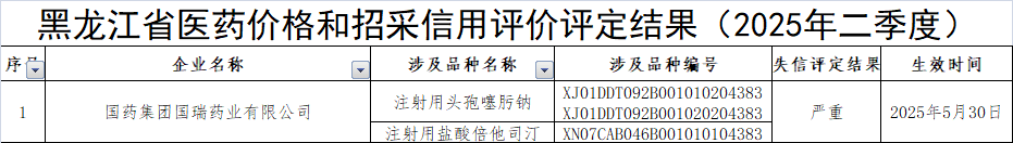 中國(guó)經(jīng)濟(jì)網(wǎng)北京8月5日訊(記者 郭文培)日前,黑龍江省公共資源交易中心發(fā)布《黑龍江省醫(yī)藥價(jià)格和招采信用評(píng)價(jià)評(píng)定結(jié)果的公示(2025年二季度)》。該中心對(duì)醫(yī)藥價(jià)格和招采失信事項(xiàng)目錄清單內(nèi)有悖誠(chéng)實(shí)信用的行為開展了信用等級(jí)評(píng)定,國(guó)藥集團(tuán)國(guó)瑞藥業(yè)有限公司被評(píng)為“嚴(yán)重失信”。