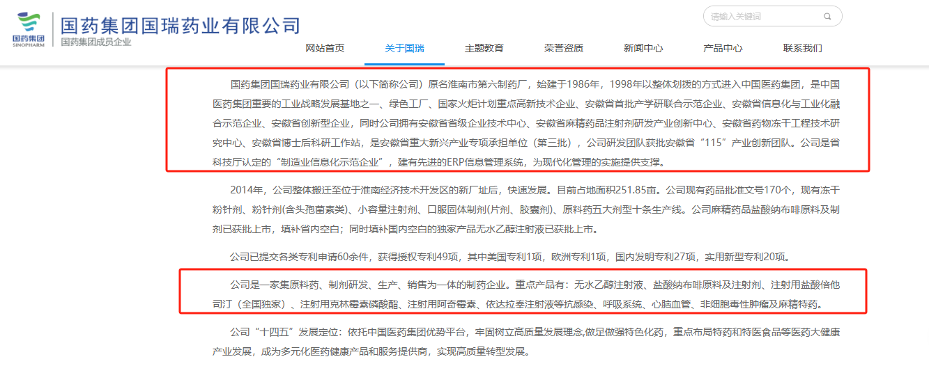 國(guó)藥集團(tuán)國(guó)瑞藥業(yè)有限公司官網(wǎng)介紹,該公司原名淮南市第六制藥廠,始建于1986年,1998年以整體劃撥的方式進(jìn)入中國(guó)醫(yī)藥集團(tuán),是中國(guó)醫(yī)藥集團(tuán)重要的工業(yè)戰(zhàn)略發(fā)展基地之一。