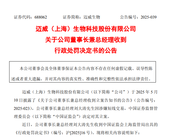 中國經(jīng)濟網(wǎng)北京8月7日訊(記者 郭文培)8月5日,邁威(上海)生物科技股份有限公司(以下簡稱邁威生物)披露公告,由于短線交易,近日公司董事長兼總經(jīng)理劉大濤收到中國證監(jiān)會上海監(jiān)管局出具的《行政處罰決定書》,劉大濤被警告并處以六十萬元罰款。