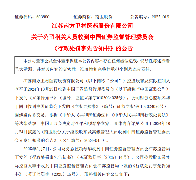 中國經(jīng)濟(jì)網(wǎng)北京8月8日訊(記者 郭文培)8月8日,江蘇南方衛(wèi)材醫(yī)藥股份有限公司(以下簡稱南衛(wèi)股份)披露公告,因內(nèi)幕交易,公司控股股東及實際控制人李平、公司財務(wù)總監(jiān)項琴華收到了中國證券監(jiān)督管理委員會江蘇監(jiān)管局下發(fā)的《行政處罰事先告知書》,李平擬被罰沒逾4710萬元,項琴華擬被罰沒逾160萬元。