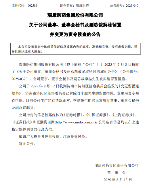 中國(guó)經(jīng)濟(jì)網(wǎng)北京8月15日訊(記者 郭文培)8月13日,瑞康醫(yī)藥集團(tuán)股份有限公司(以下簡(jiǎn)稱(chēng)瑞康醫(yī)藥)披露公告稱(chēng),公司收到濟(jì)南市濟(jì)陽(yáng)區(qū)監(jiān)察委員會(huì)簽發(fā)的《變更留置通知書(shū)》,濟(jì)南市濟(jì)陽(yáng)區(qū)監(jiān)察委員會(huì)已解除對(duì)公司董事、董事會(huì)秘書(shū)及副總裁李喆的留置措施,變更為責(zé)令候查措施。