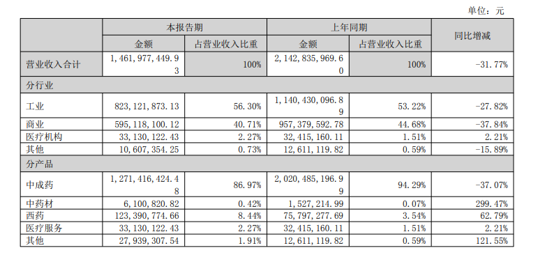 根據(jù)半年報(bào),醫(yī)藥工業(yè)仍是貴州百靈業(yè)績(jī)重要支撐,貢獻(xiàn)逾一半營(yíng)收。具體來(lái)看,工業(yè)實(shí)現(xiàn)營(yíng)收8.23億元,同比下降27.82%;商業(yè)實(shí)現(xiàn)營(yíng)收5.95億元,同比下降37.84%;醫(yī)療機(jī)構(gòu)實(shí)現(xiàn)營(yíng)收0.33億元,同比增長(zhǎng)2.21%;其他實(shí)現(xiàn)營(yíng)收0.11億元,同比下降15.89%。