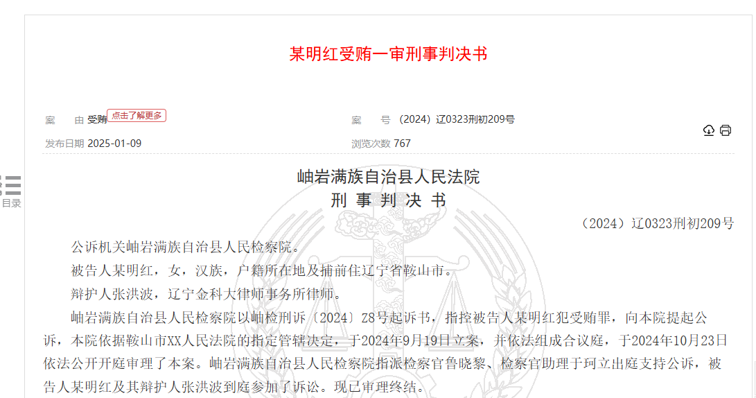 根據(jù)判決書,2015年7月至2018年12月,被告人某明紅利用其擔(dān)任藥劑科主任的職務(wù)便利,接受“李某2”請托,為“李某2”代理的昆藥集團(tuán)血塞通(凍干)、武漢人福藥業(yè)有限公司生產(chǎn)的小牛血去蛋白提取物注射液進(jìn)入醫(yī)院銷售及奧硝唑氯化鈉注射液在釆購系統(tǒng)內(nèi)進(jìn)行廠家更名等方面提供幫助,并每月在其辦公室內(nèi),收受“李某2”所送錢款共計(jì)20萬元。