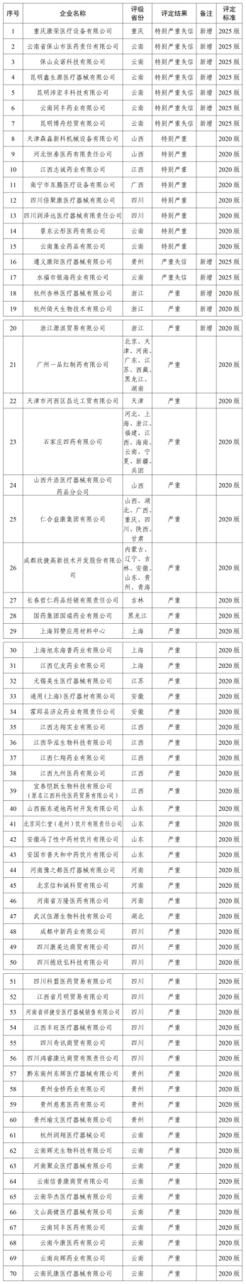 注1:《醫(yī)藥價(jià)格和招采信用評(píng)價(jià)的操作規(guī)范(2025版)》自2025年第三季度起執(zhí)行,“嚴(yán)重失信”及“特別嚴(yán)重失信”等級(jí)按2025版標(biāo)準(zhǔn)評(píng)定,其余等級(jí)按2020版標(biāo)準(zhǔn)評(píng)定。