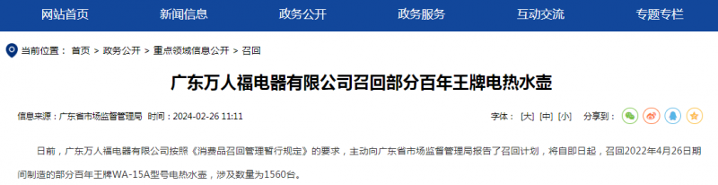 日前,廣東萬(wàn)人福電器有限公司按照《消費(fèi)品召回管理暫行規(guī)定》的要求,主動(dòng)向廣東省市場(chǎng)監(jiān)督管理局報(bào)告了召回計(jì)劃,將自即日起,召回2022年4月26日期間制造的部分百年王牌WA-15A型號(hào)電熱水壺,涉及數(shù)量為1560臺(tái)。