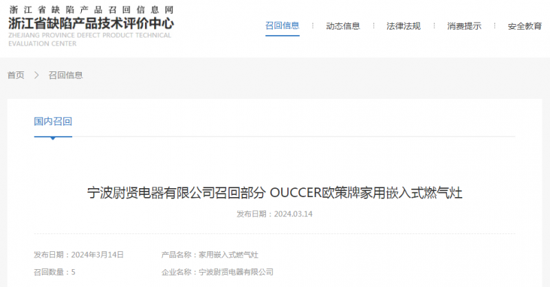 日前,寧波尉賢電器有限公司受缺陷調(diào)查影響按照《消費(fèi)品召回管理暫行規(guī)定》的要求,主動(dòng)向浙江省市場(chǎng)監(jiān)督管理局和寧波市市場(chǎng)監(jiān)督管理局報(bào)告了召回計(jì)劃,將自即日起,召回2023年3月1日期間制造的OUCCER歐策牌JZY-OC20型號(hào)家用嵌入式燃?xì)庠?,涉及?shù)量為5件。
