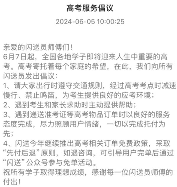 此外,閃送也向全國超過255萬閃送員發(fā)出倡議,號召騎手在高考期間文明騎行,主動向考生和家長提供幫助,用最好的精神面貌服務(wù)用戶,為高考加油。
