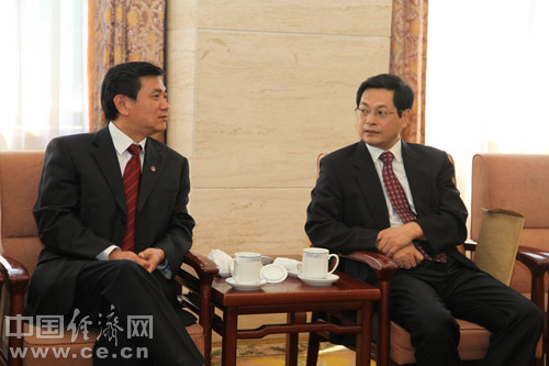 由中國道路交通安全協(xié)會、中國汽車技術研究中心和中國經(jīng)濟網(wǎng)共同主辦的“2013中國道路交通安全論壇”于8月29日在北京首都大酒店舉行。圖為交通運輸部副部長馮正霖(左)與安監(jiān)總局副局長孫華山進行交流。中國經(jīng)濟網(wǎng) 裴小閣 攝影