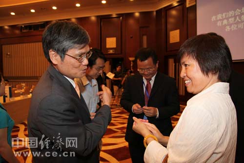 2013年全國食品安全宣傳周啟動儀式暨第五屆中國食品安全論壇6月17日在北京舉辦,今年主題為“社會共治 同心攜手維護(hù)食品安全”。圖為康師傅中央研究所所長楊乾輝與中國飲料工業(yè)協(xié)會理事長趙亞利進(jìn)行交流。 中國經(jīng)濟(jì)網(wǎng) 郝紅波/攝