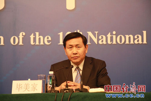 3月11日(星期一)下午3時,農(nóng)業(yè)部副部長陳曉華,農(nóng)業(yè)部總經(jīng)濟(jì)師、辦公廳主任、新聞發(fā)言人畢美家將就“增強農(nóng)村發(fā)展活力,穩(wěn)定發(fā)展糧食和農(nóng)業(yè)生產(chǎn)”的相關(guān)問題回答中外記者的提問。圖為農(nóng)業(yè)部總經(jīng)濟(jì)師、辦公廳主任、新聞發(fā)言人畢美家答記者問。(中國經(jīng)濟(jì)網(wǎng)朱津津 攝影)
