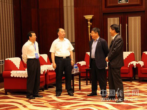 2013年全國食品安全宣傳周啟動儀式暨第五屆中國食品安全論壇6月17日在北京舉辦,今年主題為“社會共治 同心攜手維護食品安全”。圖為論壇嘉賓中糧集團董事長寧高寧(右二)與經(jīng)濟日報社社長徐如俊,經(jīng)濟日報社副總編輯丁士,中國經(jīng)濟網(wǎng)總裁王旭東交流。 中國經(jīng)濟網(wǎng) 王耀峰/攝